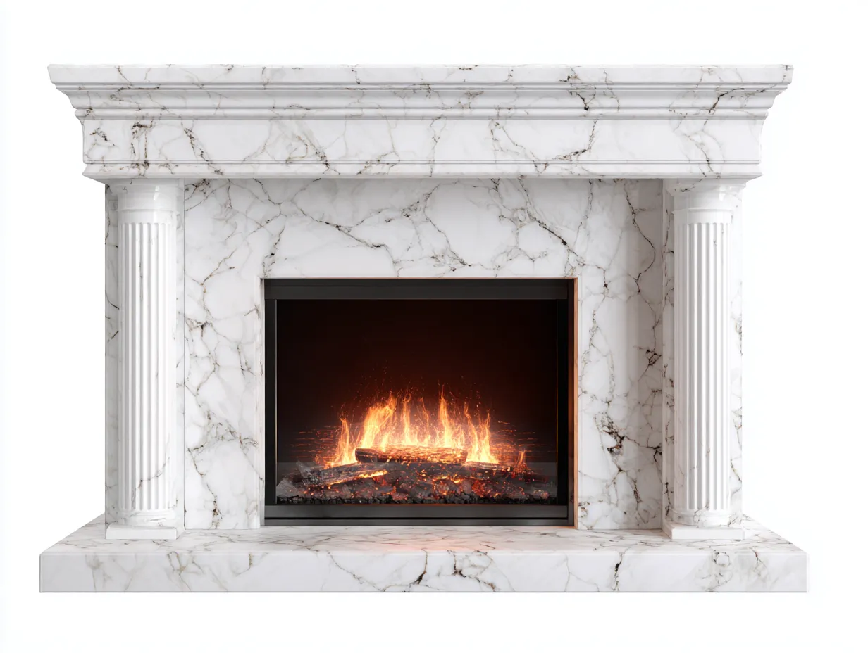Struttura realizzata in marmo di colore bianco con venature naturali diffuse. Le superfici sono rifinite con cura per garantire continuità visiva e un aspetto uniforme. L'apertura frontale è incorniciata da un telaio scuro che valorizza l'effetto fiamma.